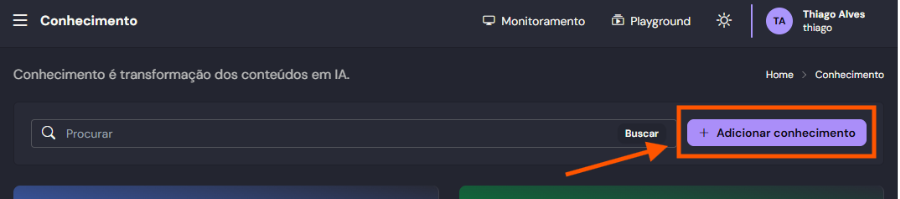 1.2. Para adicionar um novo conhecimento, clique no ícone + Adicionar conhecimento localizado no canto superior direito da tela: