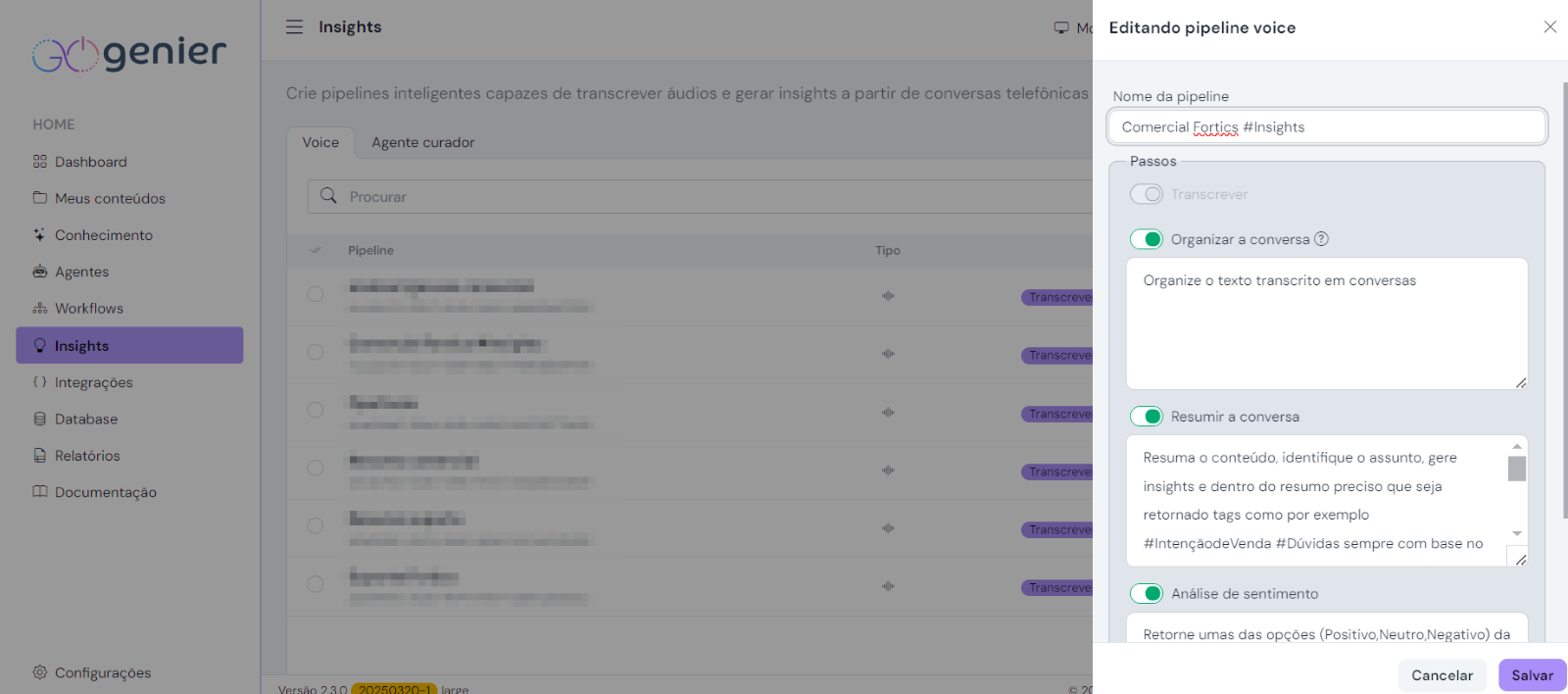 Os insights são totalmente personalizáveis, de acordo com o prompt configurado no menu de Insights do GOgenier, permitindo extrair informações relevantes de acordo com os objetivos do seu negócio.