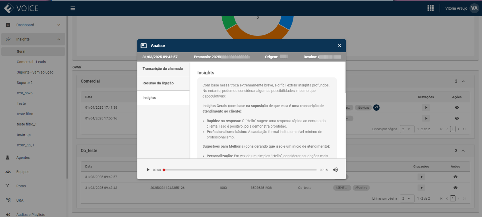 Resumo da ligação: Temos um leque de opções para organizar o resumo da ligação, você pode configurar o prompt desejado no menu de Insights do GOgenier, e o retorno desse prompt é visto no VOICE.