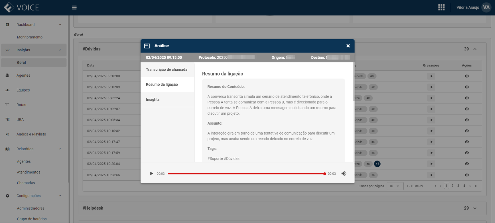 Transcrição de chamada: Nessa parte é transcrito todo o diálogo entre o agente e o usuário.