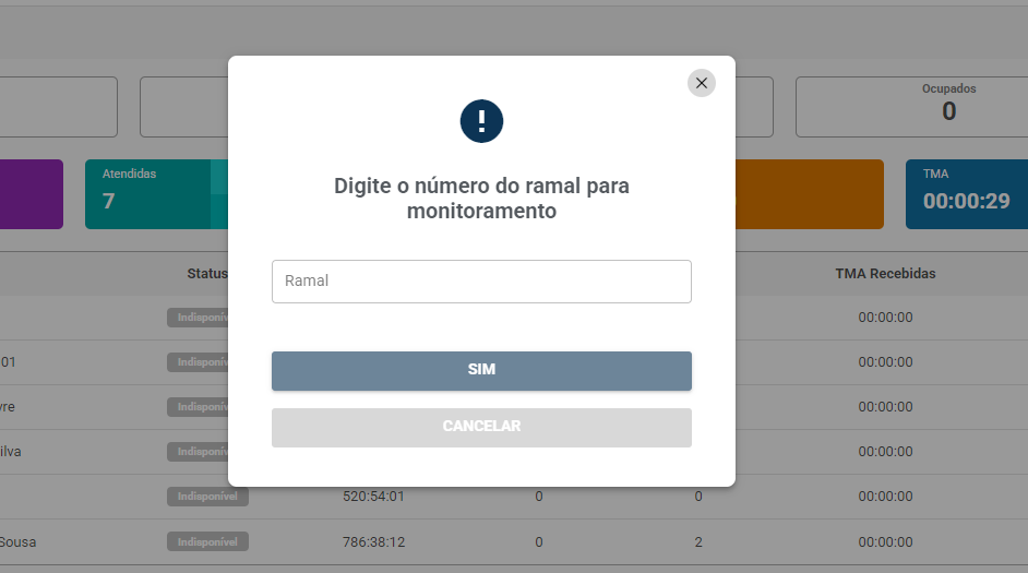 Para usar as opções de ouvir, sussurrar ou interagir, será aberto um modal onde você deve informar o número do ramal a ser monitorado.