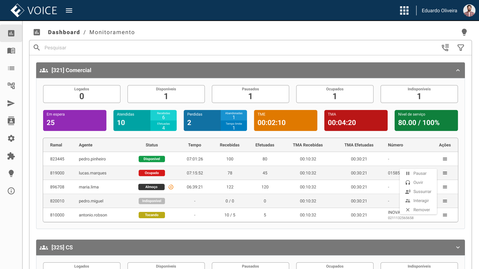 O módulo de Monitoramento do Voice permite o acompanhamento em tempo real das filas de atendimento da sua operação.