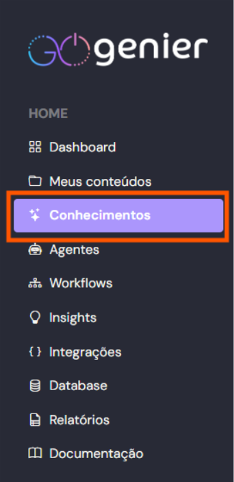 1.1. Dentro do GOgenier, acesse a opção Conhecimentos, localizada no menu lateral: