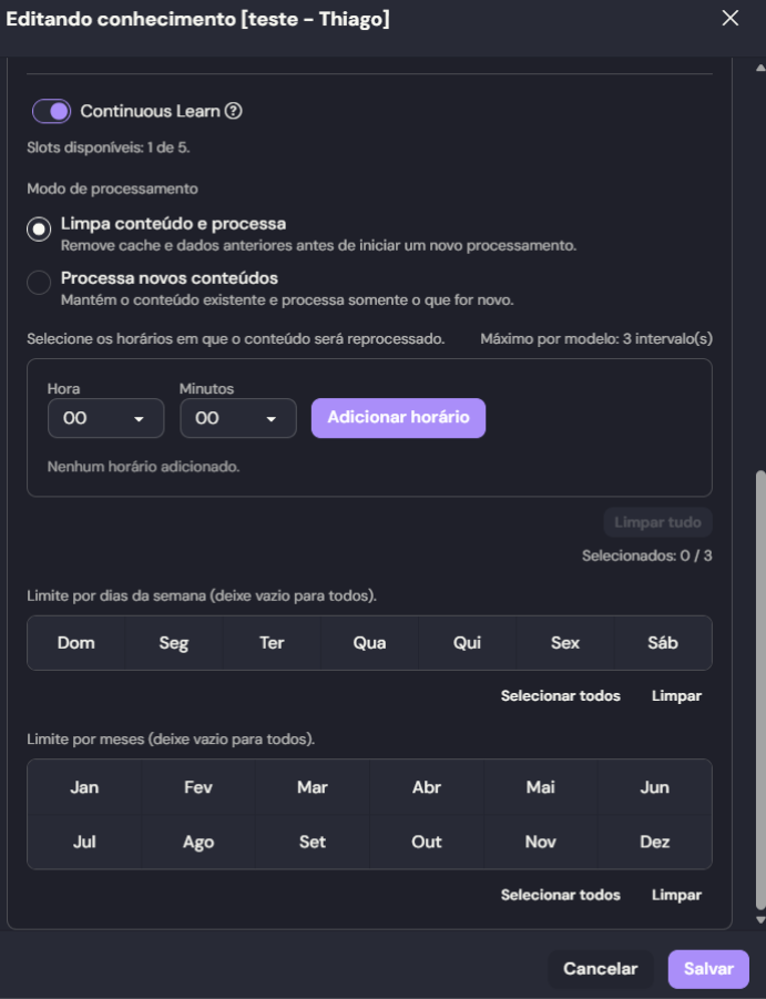 Com o Continuous Learning, é possível configurar o GOgenier para reprocessar esse conhecimento automaticamente em horários específicos — por exemplo, às 10h e às 22h — garantindo que o agente trabalhe sempre com dados atualizados, sem necessidade de intervenção manual.