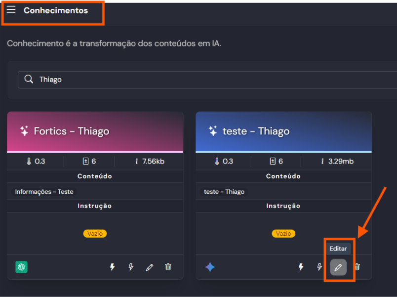 1.2. Selecione o conhecimento em que deseja aplicar o Continuous Learning e clique em Editar:
