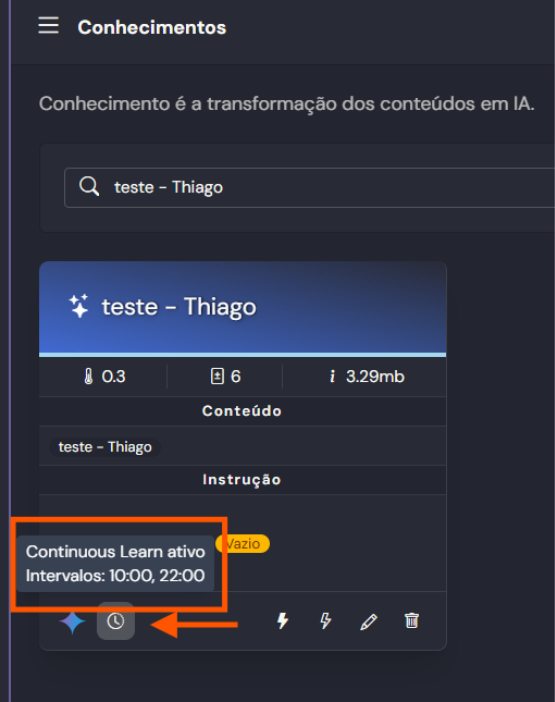 Agora, este conhecimento está com o Continuous Learning devidamente configurado. Ao visualizar o conhecimento, será possível ver um ícone de relógio, indicando que ele possui o Continuous Learning ativo: