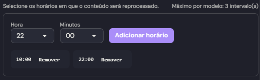 No primeiro campo, você deve definir horários específicos em que o conhecimento será processado automaticamente. Basta escolher um horário e clicar em Adicionar Horário.