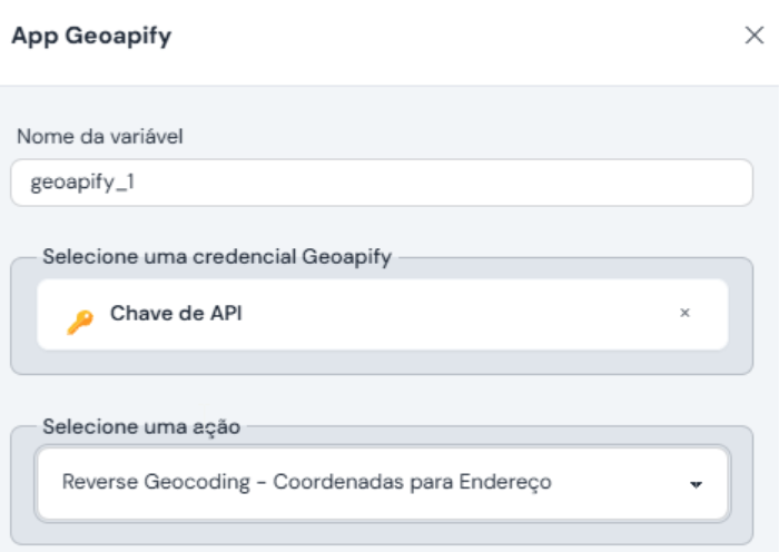 - Escolha a ação desejada, por exemplo: "Reverse Geocoding – Coordenadas para Endereço"