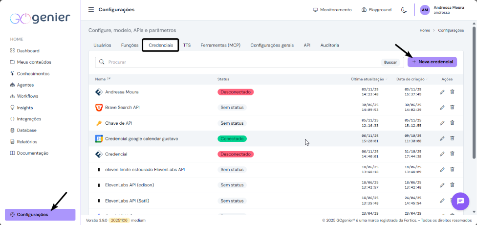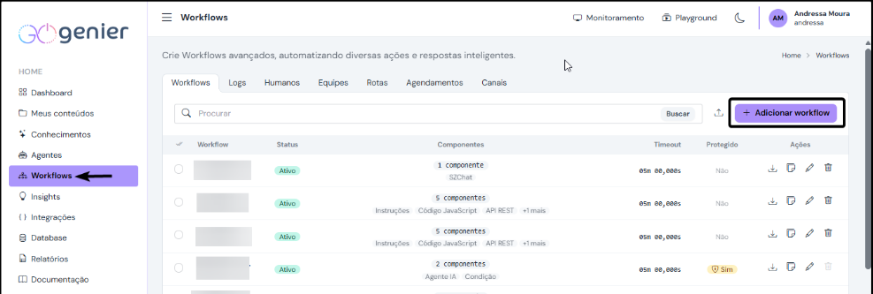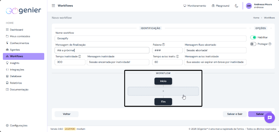 Crie ou edite um agente no GOgenier e vincule o workflow criado. Assim, o agente poderá converter automaticamente a localização enviada pelo cliente (por exemplo, via WhatsApp) em um endereço completo.