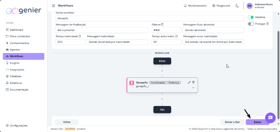 Após salvar, o componente Geoapify será adicionado, clique em Salvar novamente para concluir o workflow.