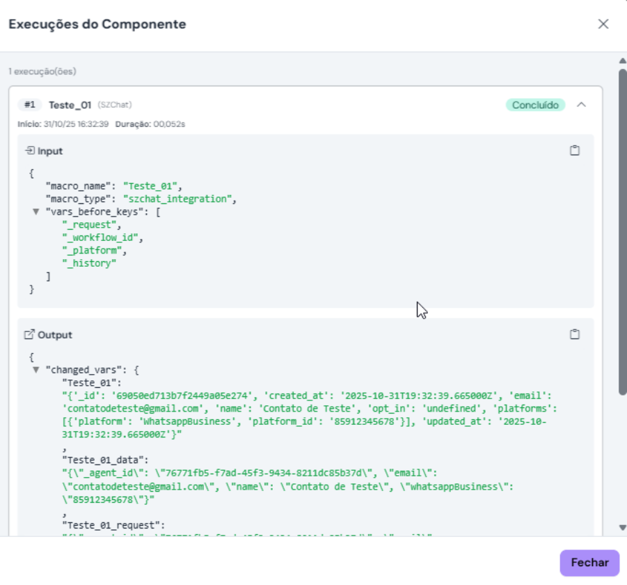 - Exibe os dados retornados pelo componente após a execução, incluindo variáveis alteradas e identificadores gerados.