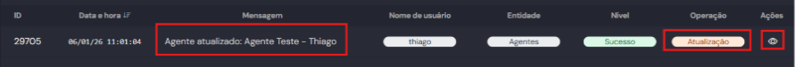 Importante: Ao excluir um agente, por exemplo, a auditoria mantém o histórico completo das informações existentes no momento da exclusão, mesmo após a remoção do registro, respeitando o período de retenção configurado em Configurações > Configurações Gerais. |
