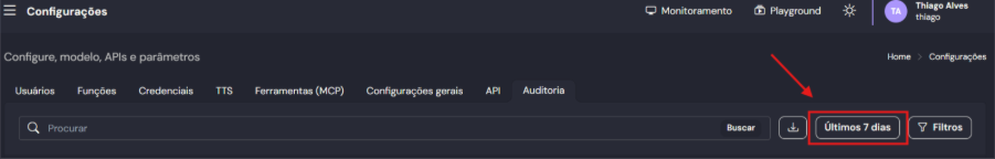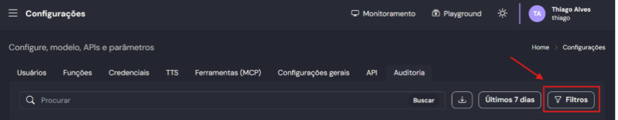 - Usuário: ao buscar por um usuário específico e aplicar o filtro, serão exibidos apenas os registros de auditoria referentes ao usuário selecionado: