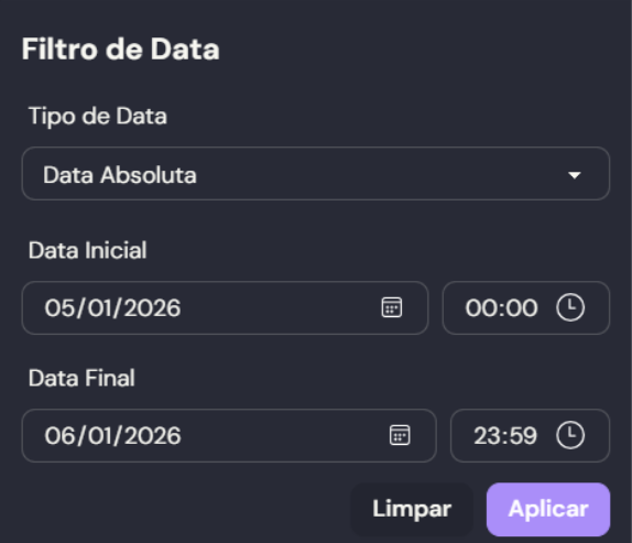 Ao selecionar a opção Data Absoluta, é necessário informar a data e o horário de início e de fim do período a ser filtrado: