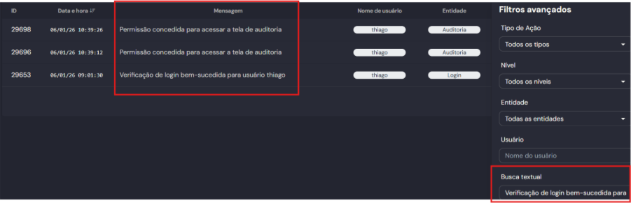 - Busca textual: permite buscar por palavras-chave ou frases presentes na mensagem do registro de auditoria: